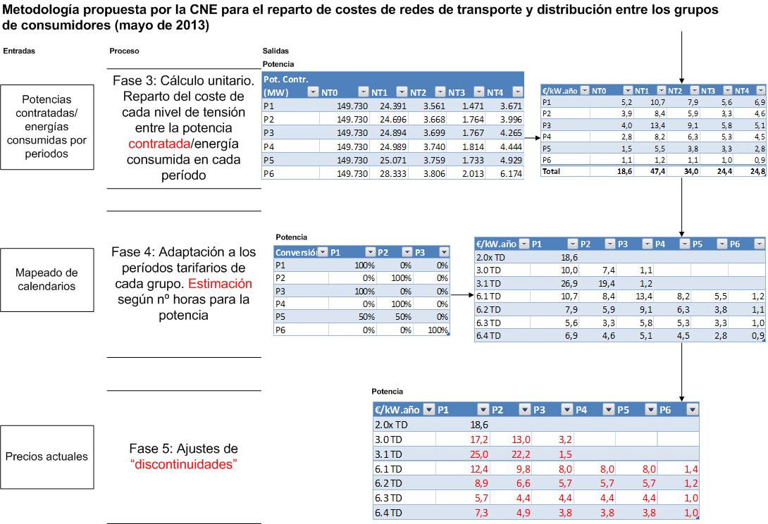 Una vez obtenidos los costes a repartir entre los términos de potencia y energía, la CNE pasa a imputarlos entre los distintos grupos de consumidores. La metodología seguida a partir de este momento es análoga entre los procesos paralelos de reparto de los términos de potencia y energía, razón por la cual a la fase previa anterior la numero como fase cero (algún disgusto me costará con algún amigo «cuadriculado»…).