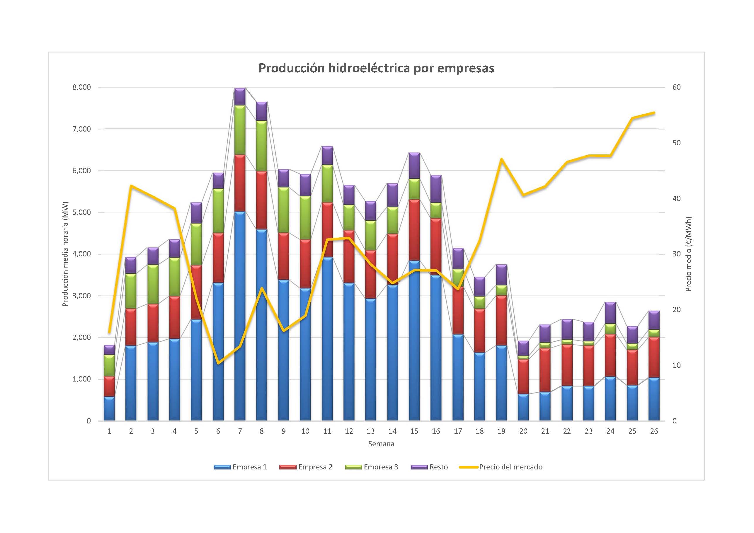 El gráfico siguiente muestra la evolución de la producción hidroeléctrica por empresas. Puede comprobarse fácilmente que una de ellas -la de mayor producción- comenzó a reducir su producción durante la semana 17 y, sobre todo, a partir de la semana 20. No se aprecia, sin embargo, que el segundo agente en tamaño haya variado su aportación. Respecto del tercero, de mucha menor influencia en la producción total, sí se puede decir que empezó a reducir su producción hidroeléctrica unas semanas antes de que lo hiciera el primero, siguiendo la estrategia de ésta de hacerlo drásticamente a partir de la semana 20
