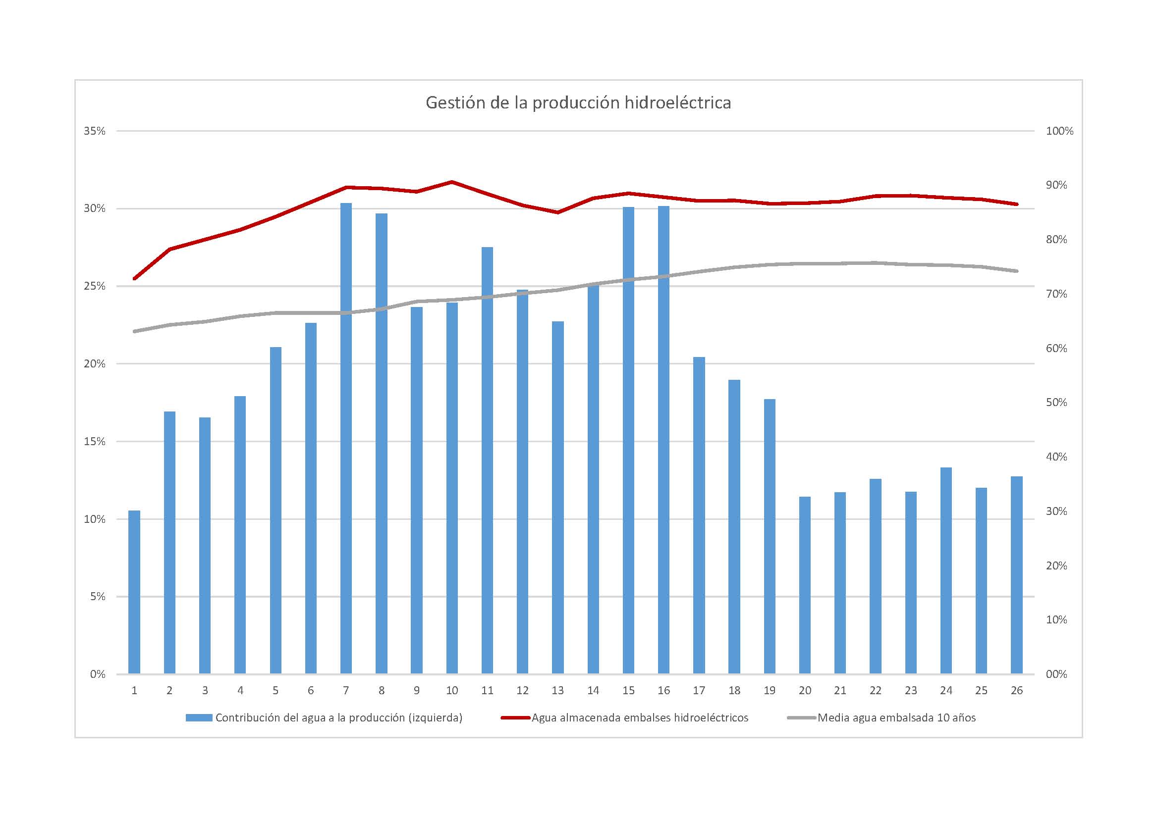 Efectivamente, el gráfico siguiente muestra la evolución de la contribución hidroeléctrica respecto del total de la producción en las semanas que llevamos de 2014. Es notorio que la producción hidroeléctrica a partir de la semana 20 se ha reducido sustancialmente mientras que los niveles de agua embalsada siguen superando en más de 12 puntos porcentuales el valor medio en esta época del año.